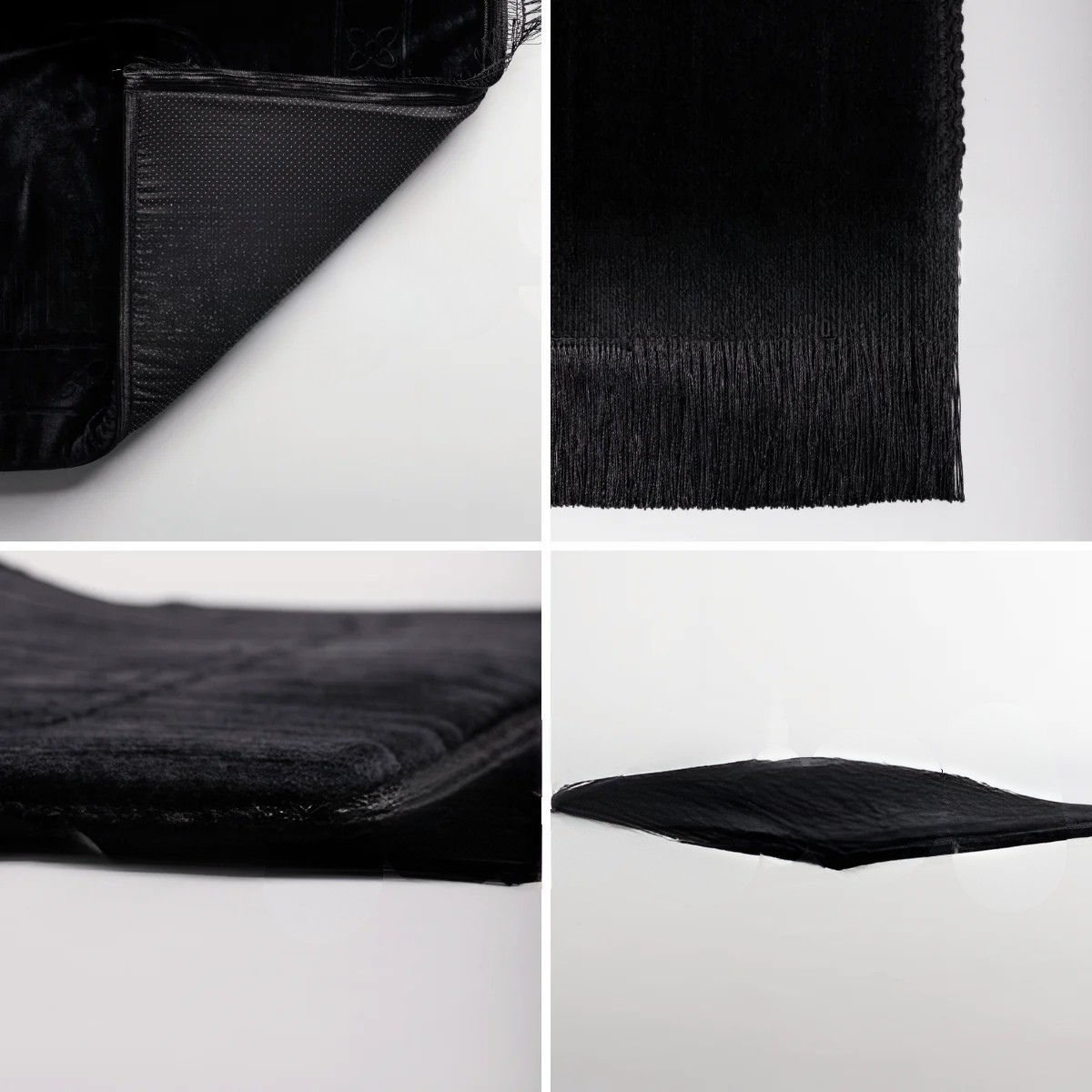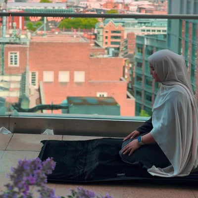 الركوع على طبقة متطورة من جلّ الهواء مع إسفنج الذاكرة، حيث تقوم سجادة ErgoSalah بتوزيع الضغط بشكل متساوٍ، وتخفف الألم، وتدعم صحة الركبتين، كما هو موضّح في الصورة السفلية.